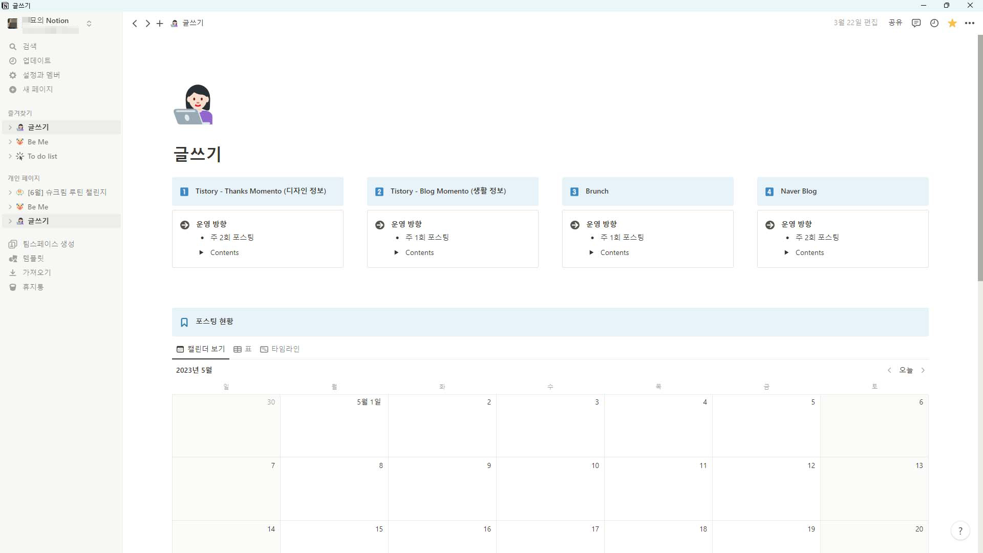 이제 개인 계정에서는 글쓰기, 독후활동 등 제 개인적인 스캐줄을 관리하고 콘텐츠를 관리하는 용도로만 사용하려고 합니다.