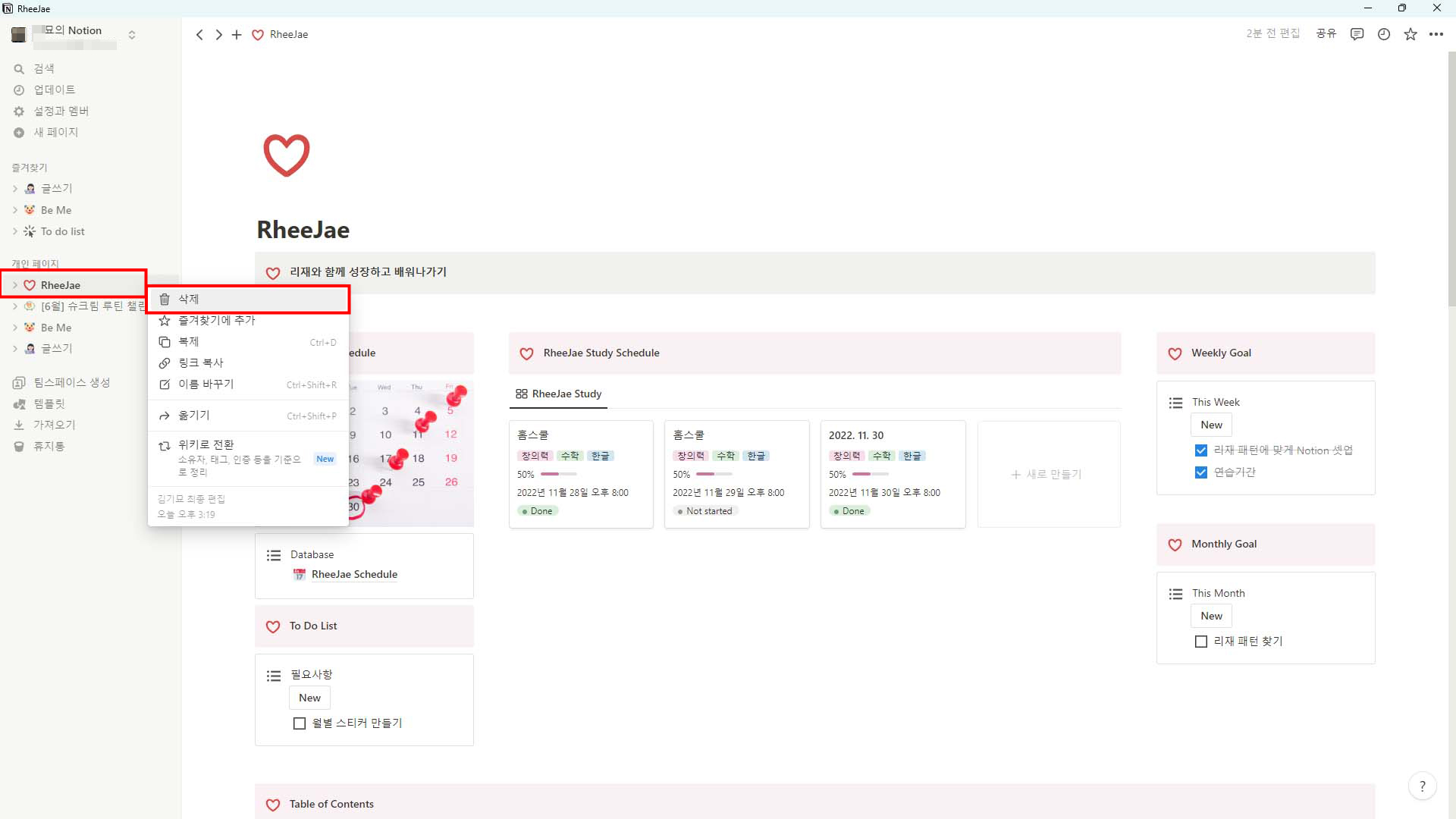 개인 계정인 '묘의 Notion'에서 딸 아이 리재 스캐줄만 분리하려고 합니다.
